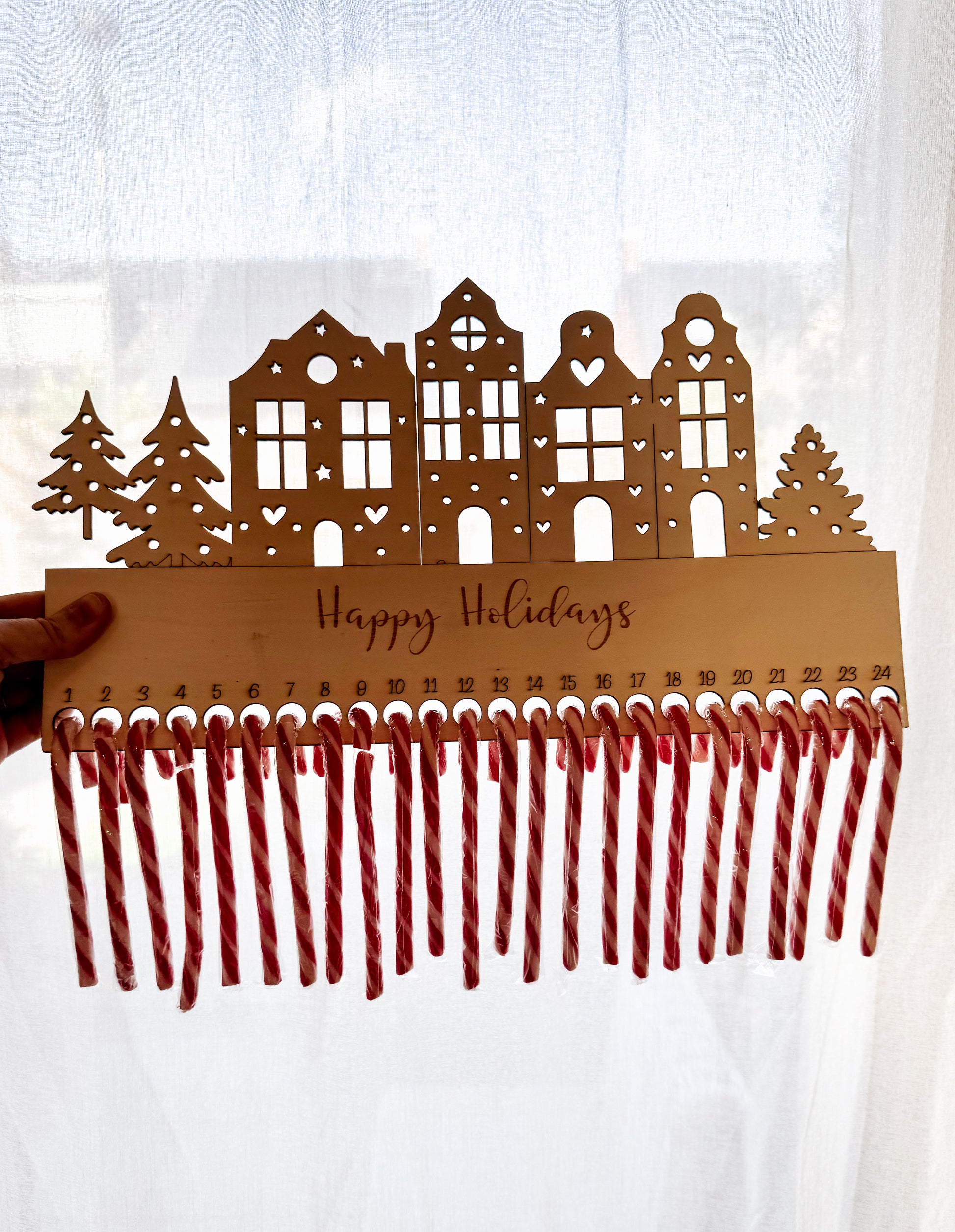 De kalender is stijlvol vormgegeven met houten huisjes en kerstbomen, en brengt direct een warme kerstsfeer in huis. Leuk om samen met kinderen elke dag een snoepje af te halen, maar ook een originele eyecatcher als kerstdecoratie.
