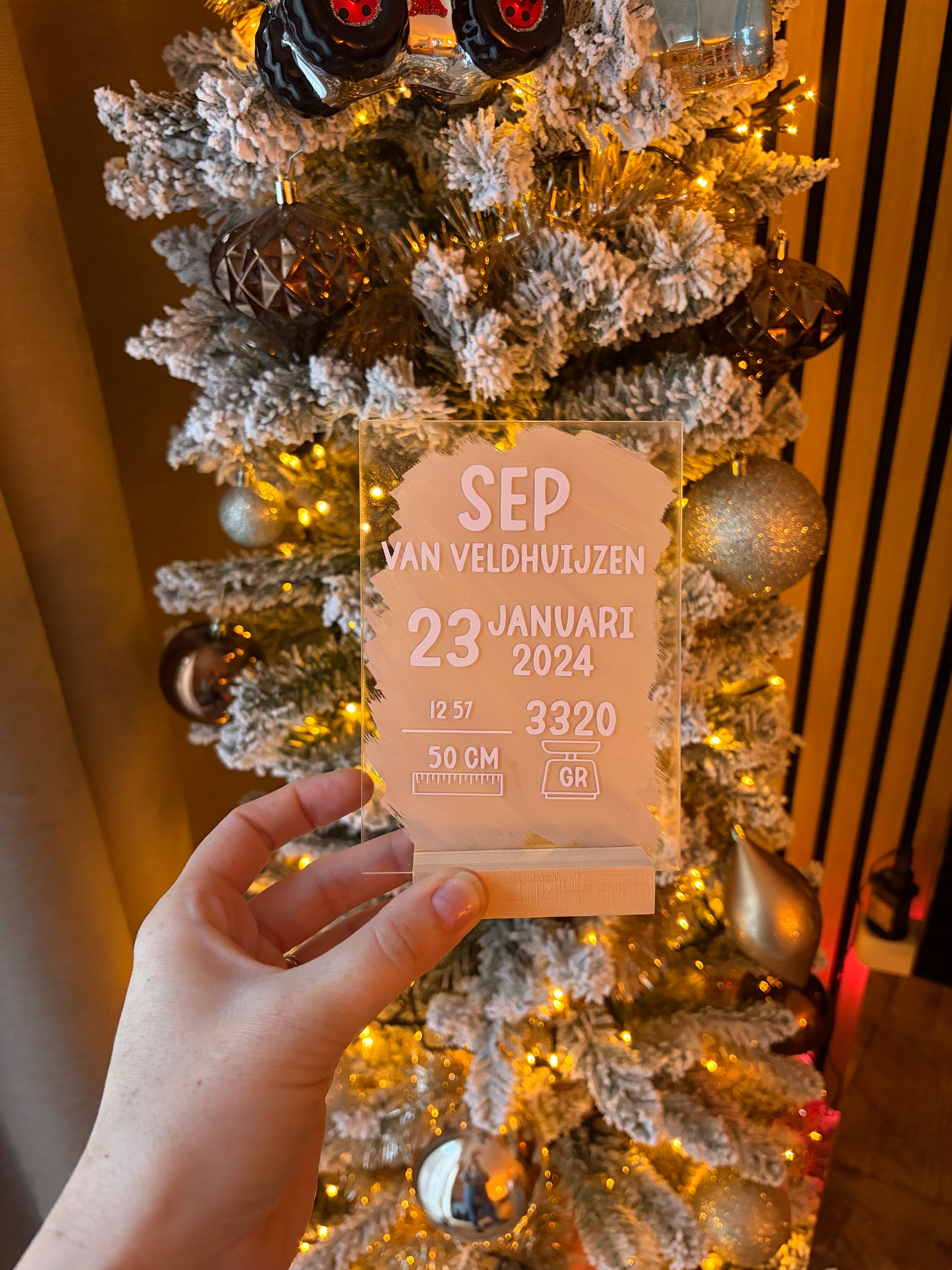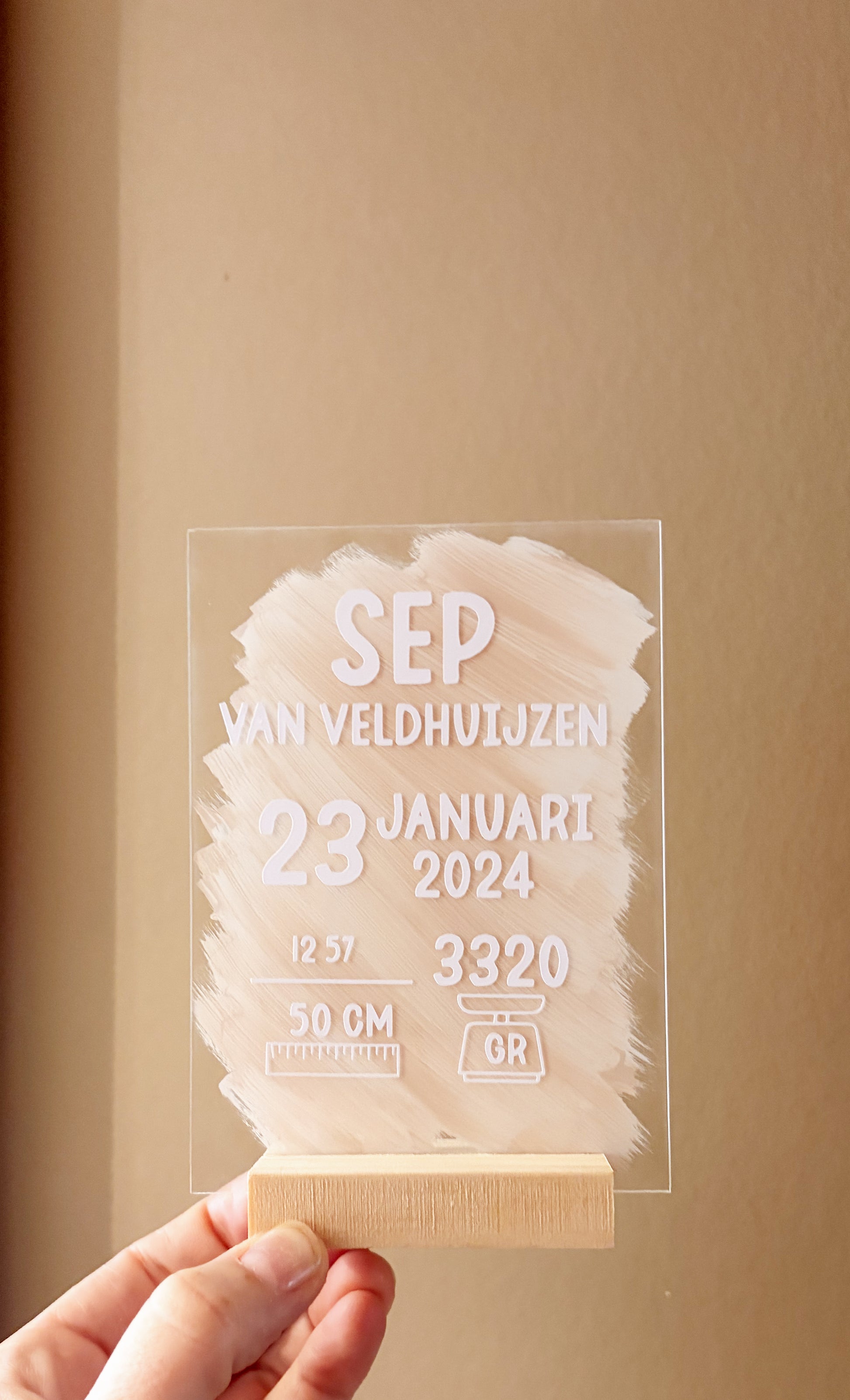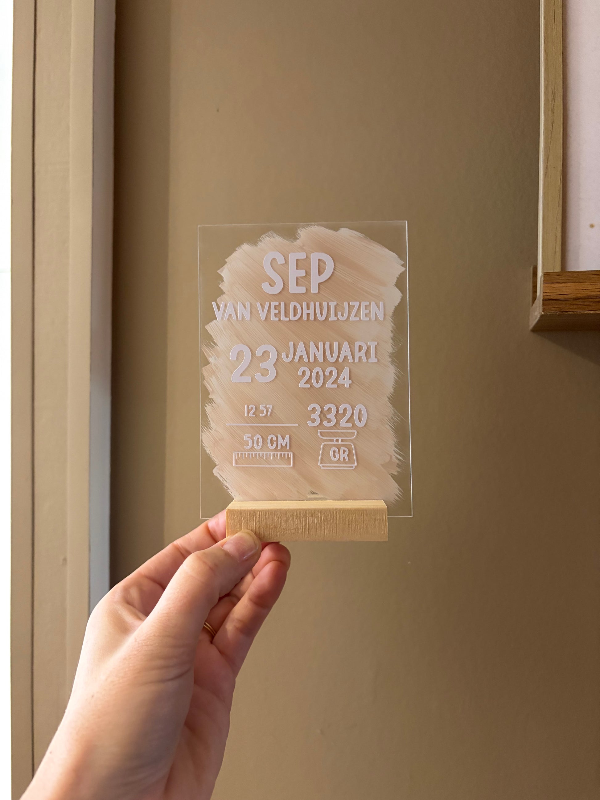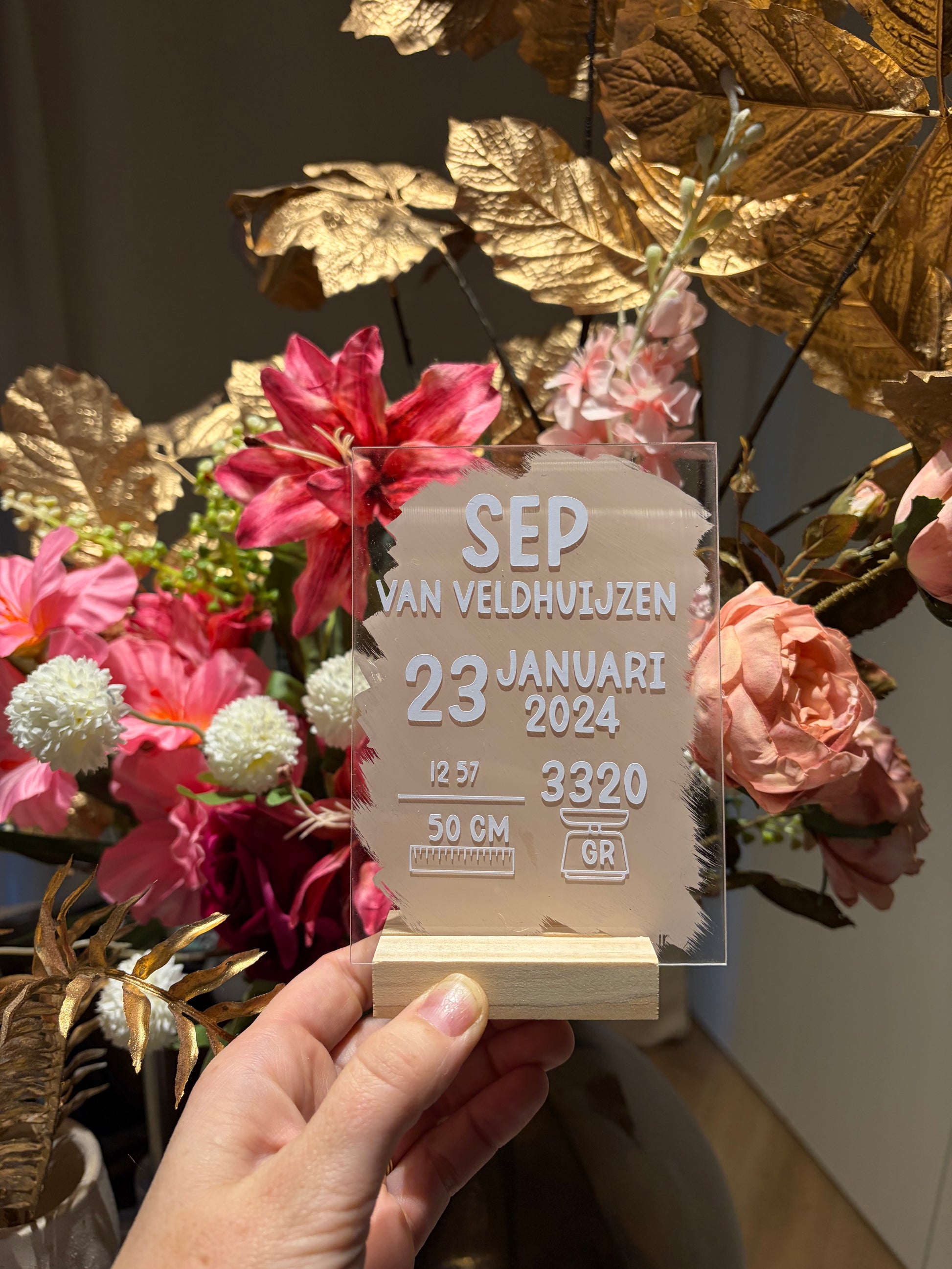 Dit stijlvolle geboortebord is gemaakt van helder acryl met een handgeschilderde brush-achtergrond en fijn gelaserde geboortegegevens. Dankzij de houten standaard staat het bordje prachtig in de babykamer, op een plankje of bij een kraamcadeau.