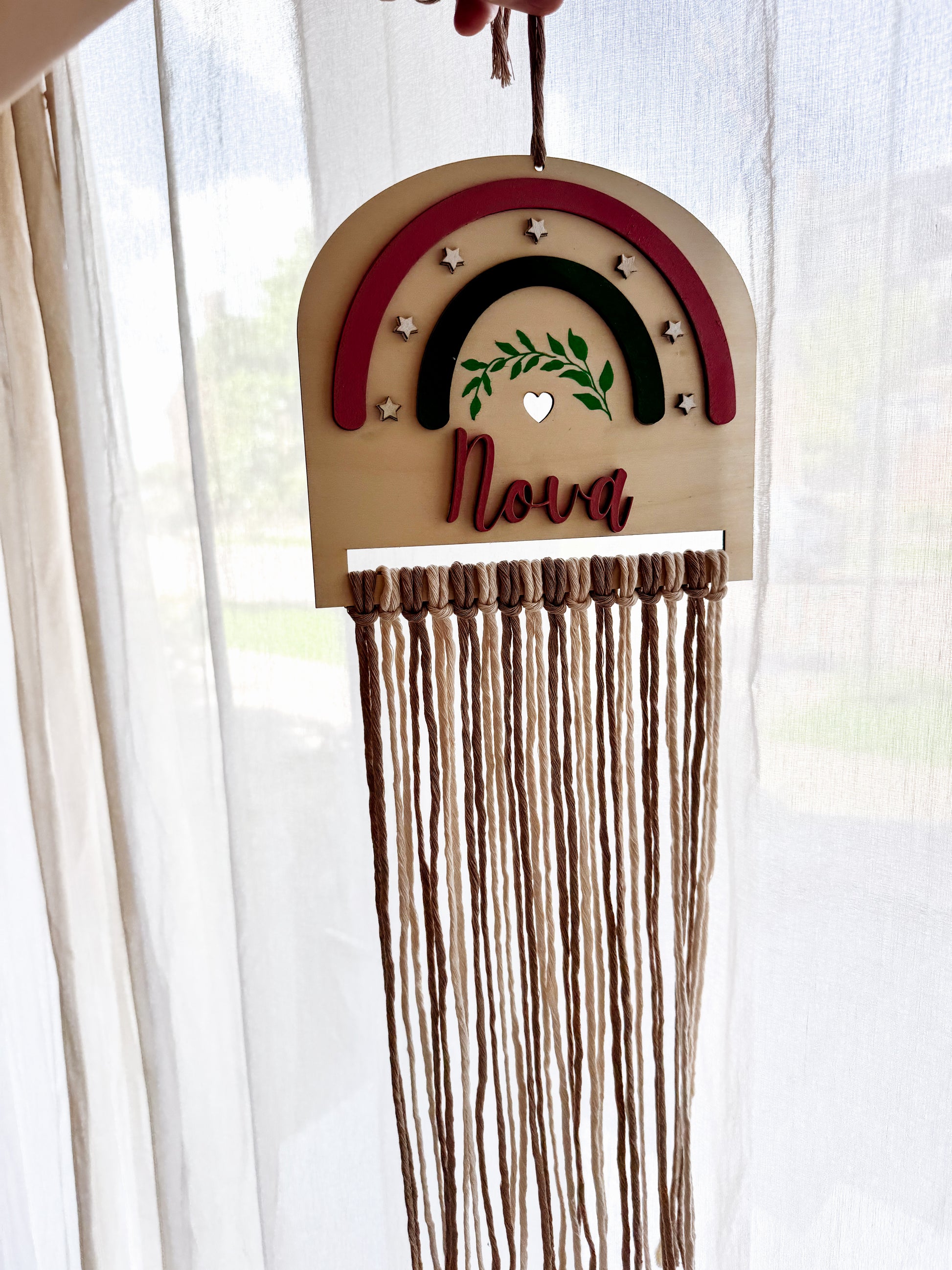 Met deze prachtige houten hanger berg je haarclipjes en strikjes op een stijlvolle manier op. Het regenboogdesign, gecombineerd met de speelse koorden, maakt het niet alleen praktisch maar ook een echte eyecatcher in de kinderkamer.