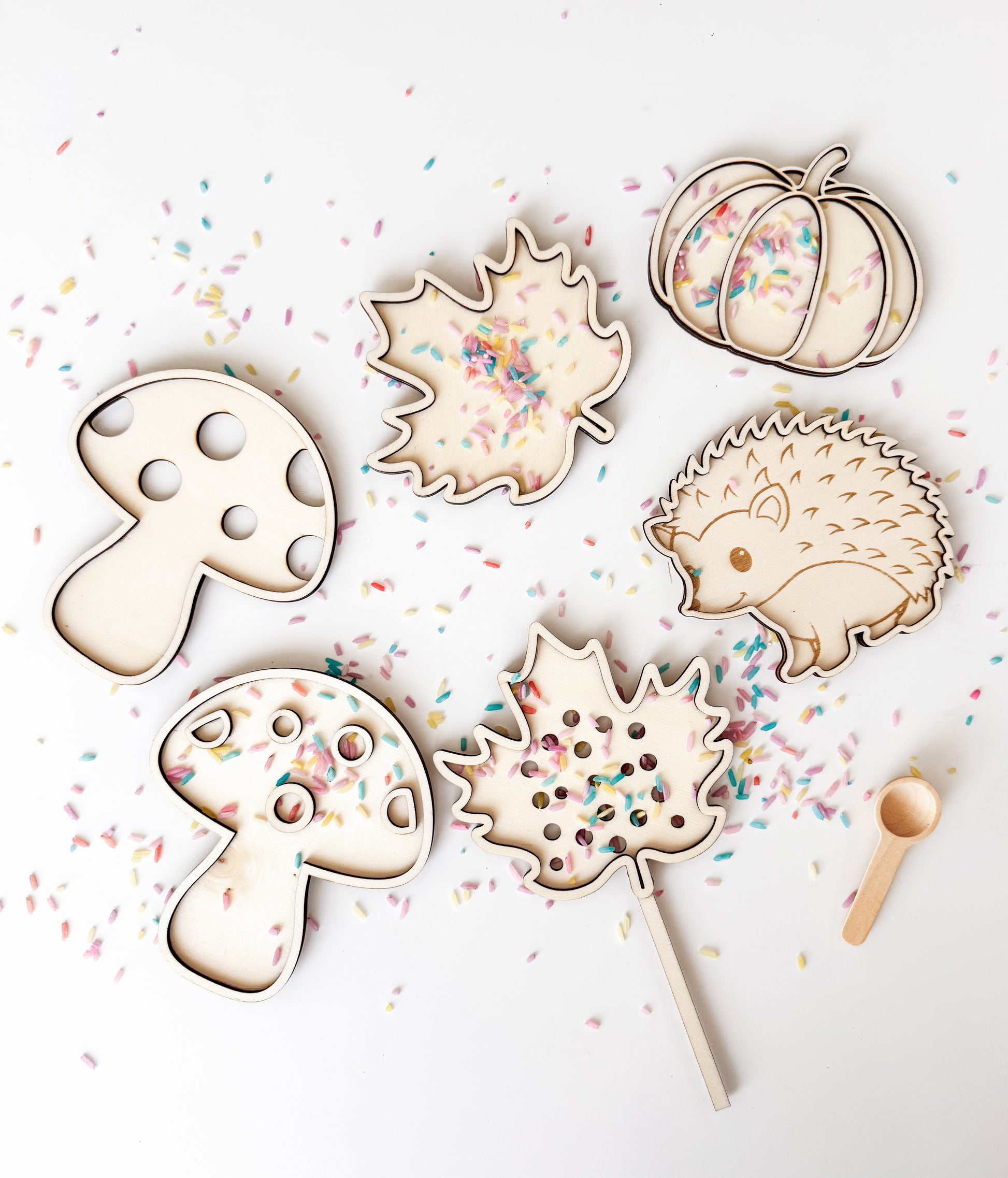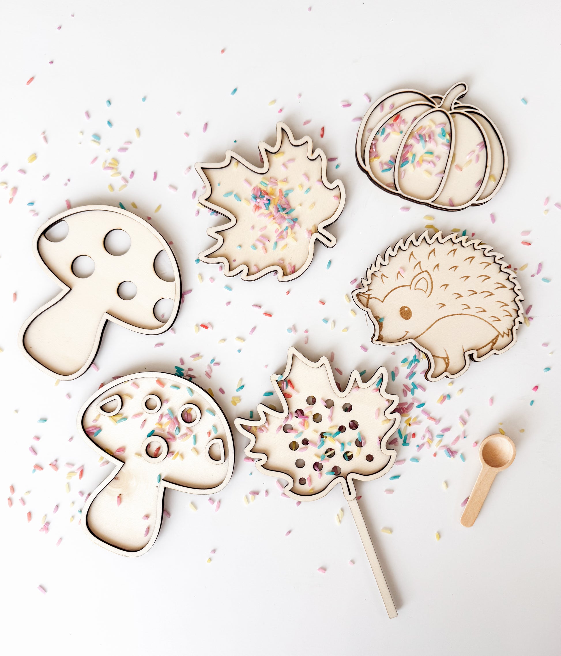 Breng de magie van de herfst naar de speeltafel met deze houten vulvormen. Vul de egel, pompoen, het blaadje en de paddenstoel met rijst, kralen of andere kleine materialen en ontdek telkens een nieuwe manier van spelen.