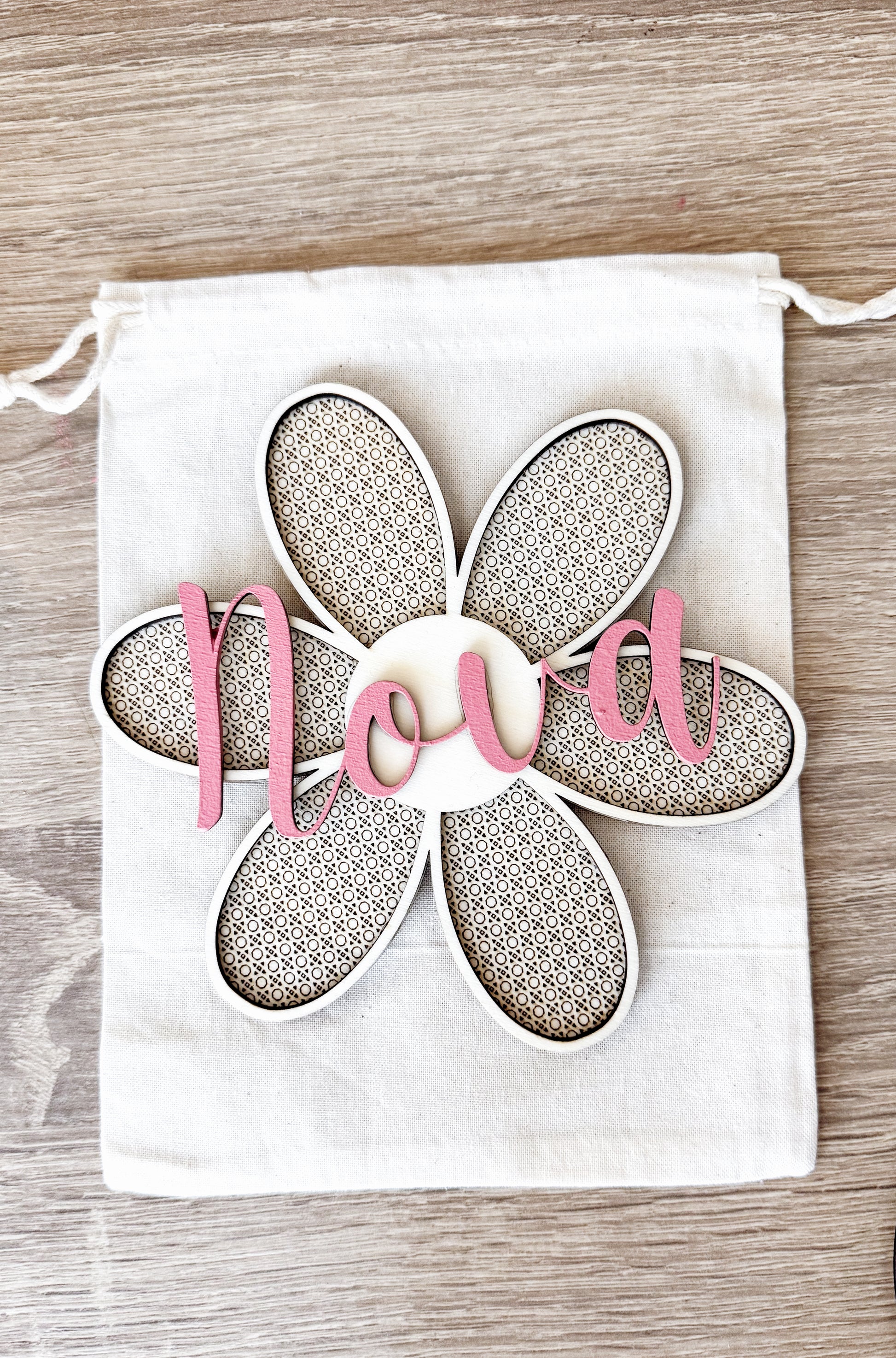 Dit houten naambordje in de vorm van een bloem is een echte blikvanger voor de kinderkamer of aan de deur. Met de persoonlijke naam en het speelse design voeg je direct een warme en vrolijke sfeer toe aan elke ruimte.