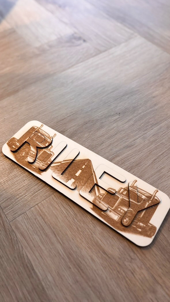 Voor kleine truckliefhebbers! Deze unieke houten naam puzzel is speciaal ontworpen voor stoere kids die gek zijn op vrachtwagens. De naam wordt in mooie, grote letters uitgesneden, terwijl op de achtergrond een realistische gravure van twee vrachtwagens en een weg zichtbaar is.