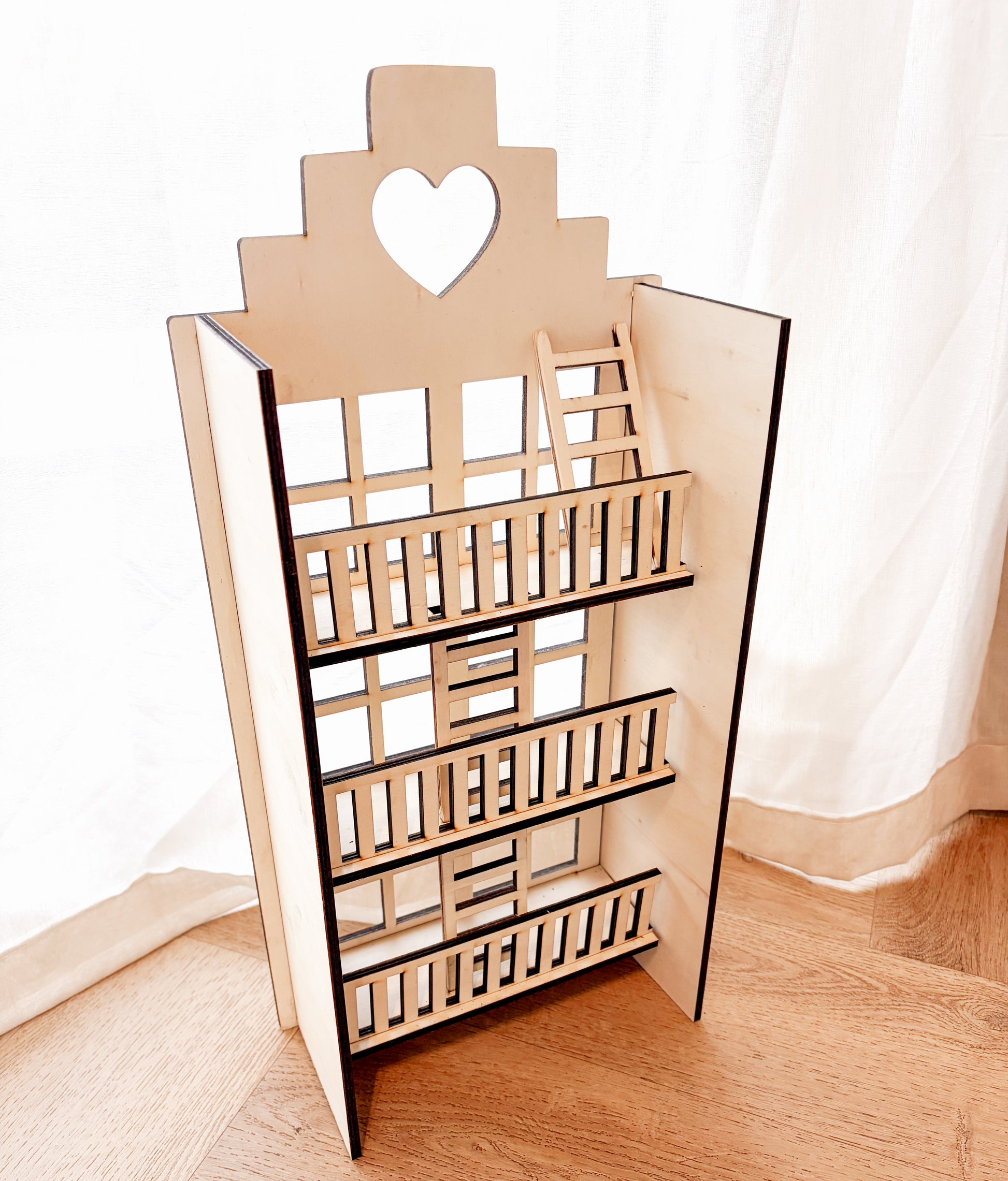 Dit prachtige houten poppenhuis is met liefde ontworpen en gemaakt in de herkenbare stijl van een Amsterdamse grachtengevel. Het hartvormige raam bovenaan zorgt voor een speelse, warme uitstraling.