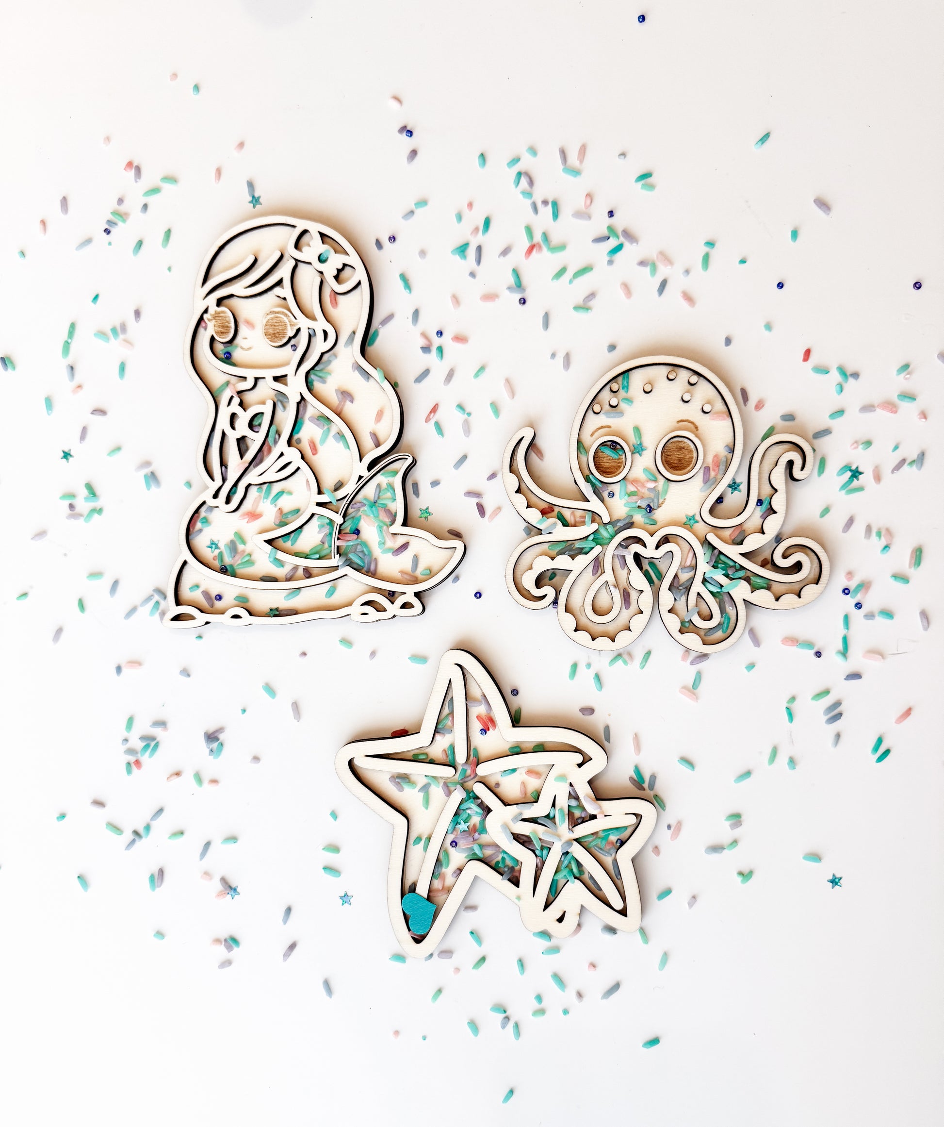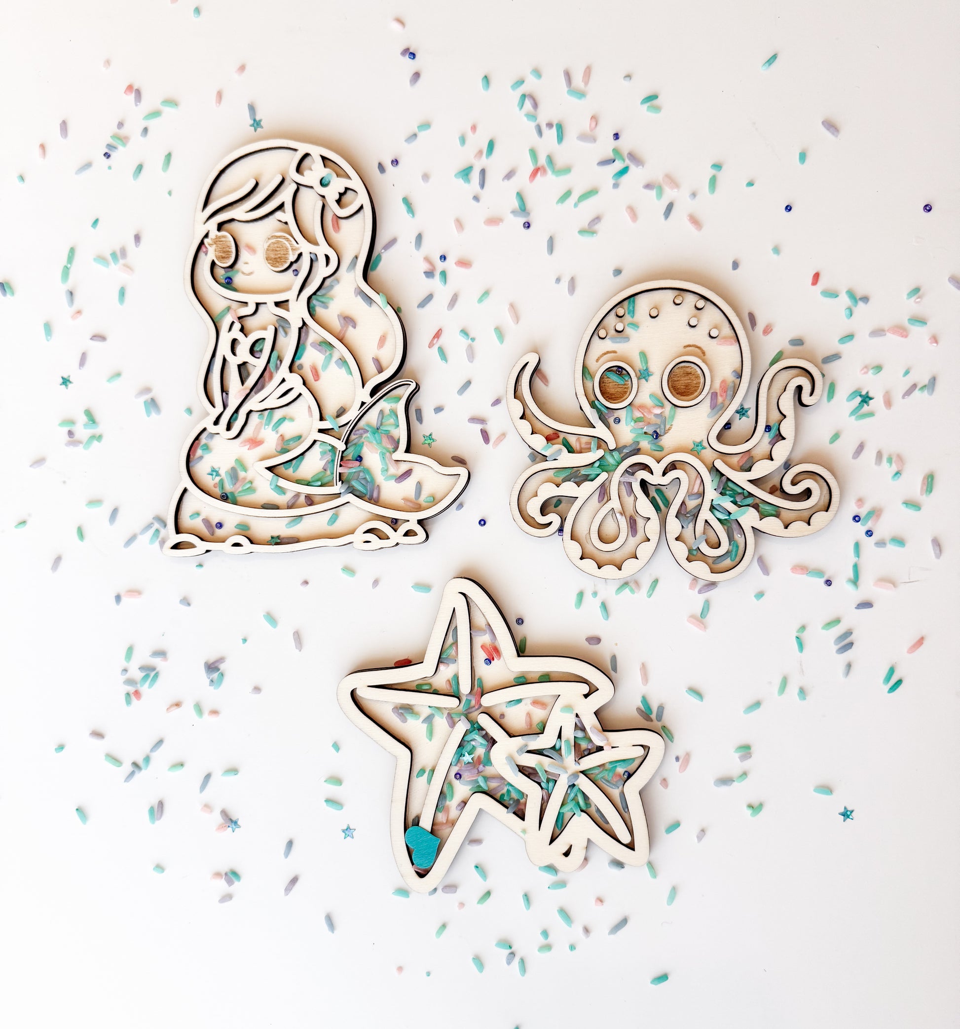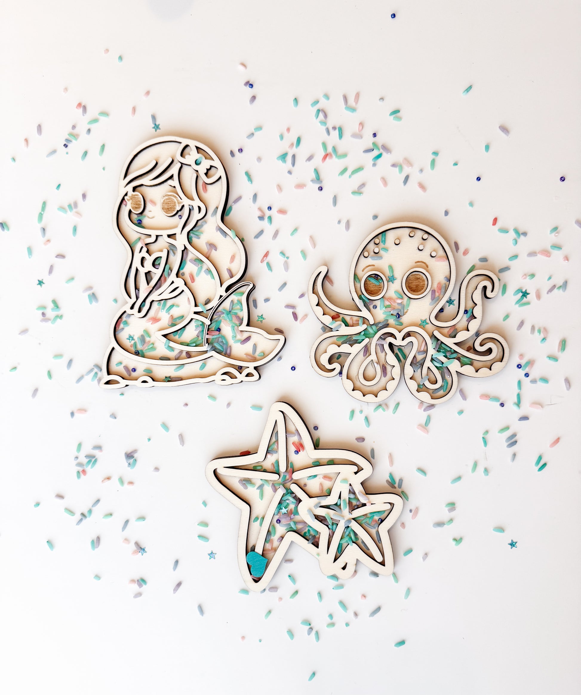 Deze houten vulvormen nemen je mee naar een betoverende onderwaterwereld. Met de zeemeermin, octopus en sterren kunnen kinderen spelenderwijs ontdekken, voelen en creëren. Vul de vormen met rijst, kralen, zand of andere materialen en stimuleer zo de fijne motoriek, concentratie en creativiteit.