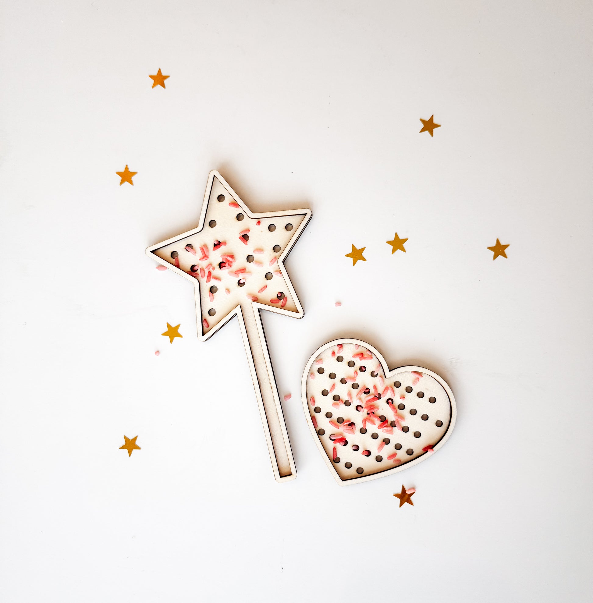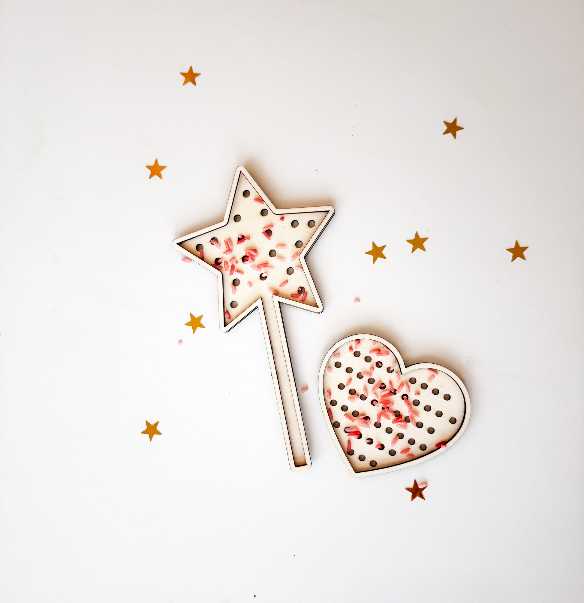 Deze unieke houten zeefjes in de vorm van een ster en een hartje maken het spelen nóg leuker! Kinderen kunnen er allerlei materialen doorheen laten gaan, zoals zand, rijst of kleine speelsteentjes. Zo ontdekken ze op een speelse manier wat blijft liggen en wat erdoorheen valt.