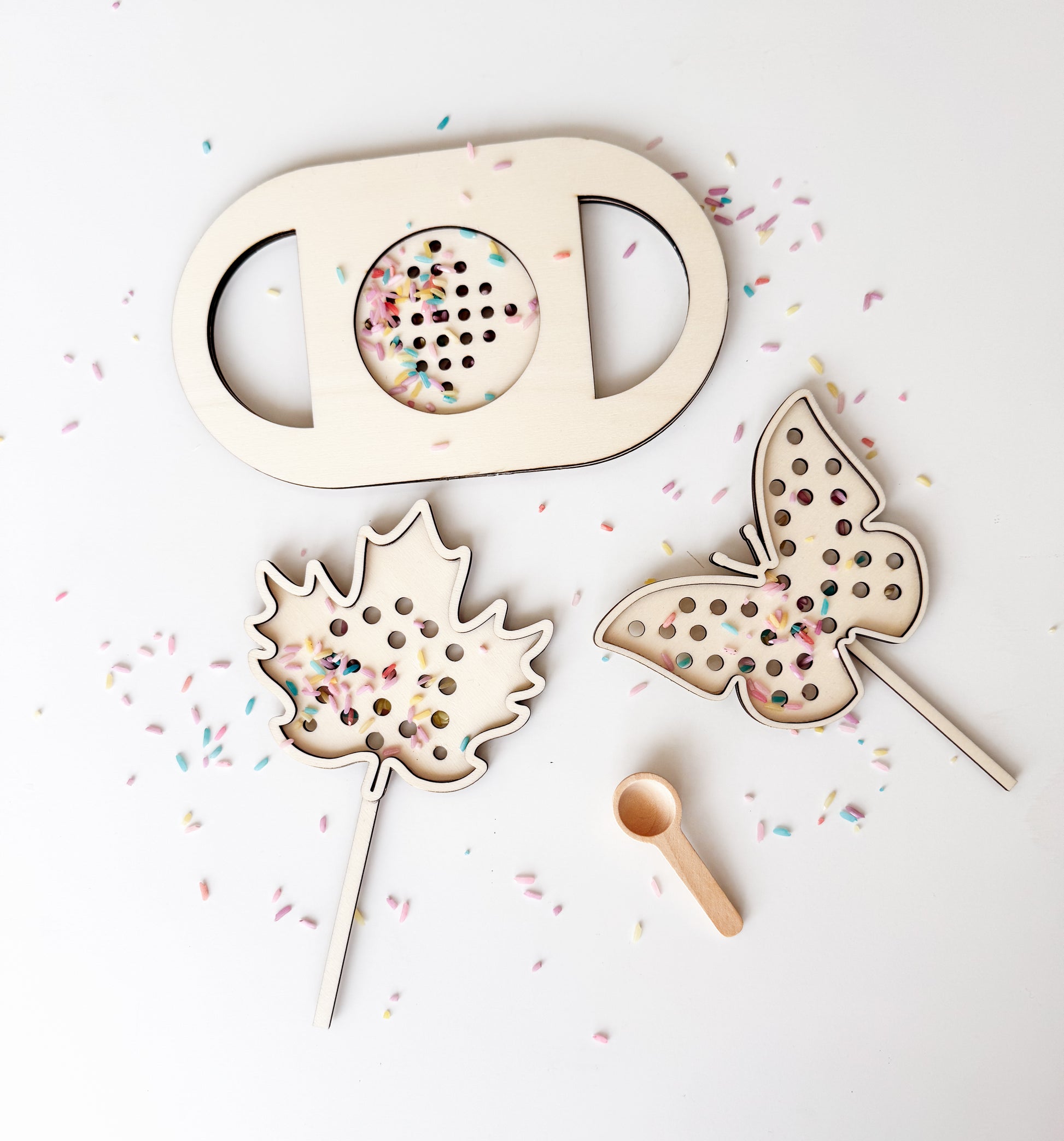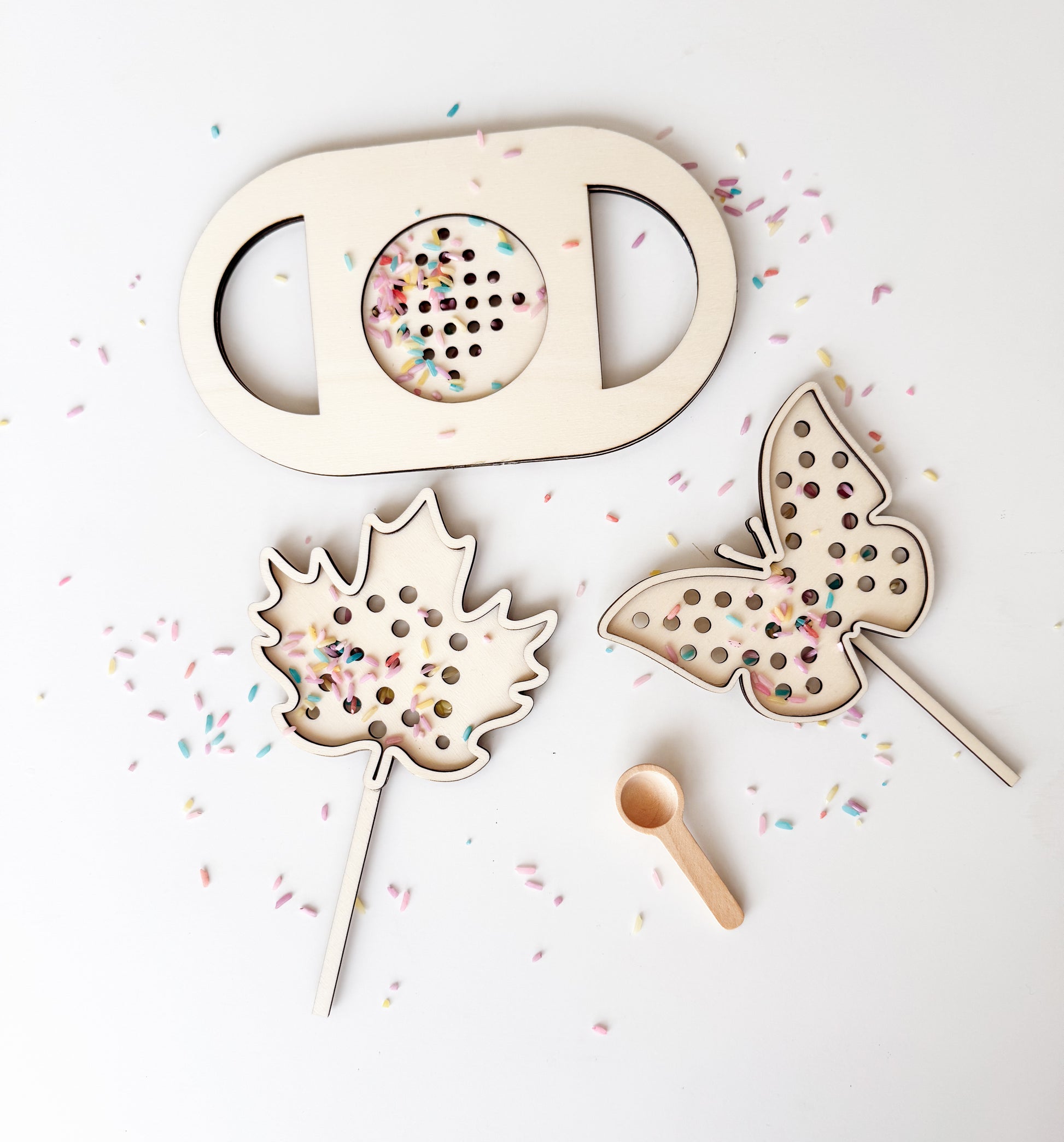 Ontdekken, experimenteren en spelen – met deze houten zeefjes wordt elk spel een avontuur! De set bestaat uit een blad, een vlinder en een ovaal zeefje. Kinderen kunnen er rijst, zand, steentjes of andere kleine materialen doorheen laten gaan en zien wat blijft liggen en wat erdoorheen valt.
